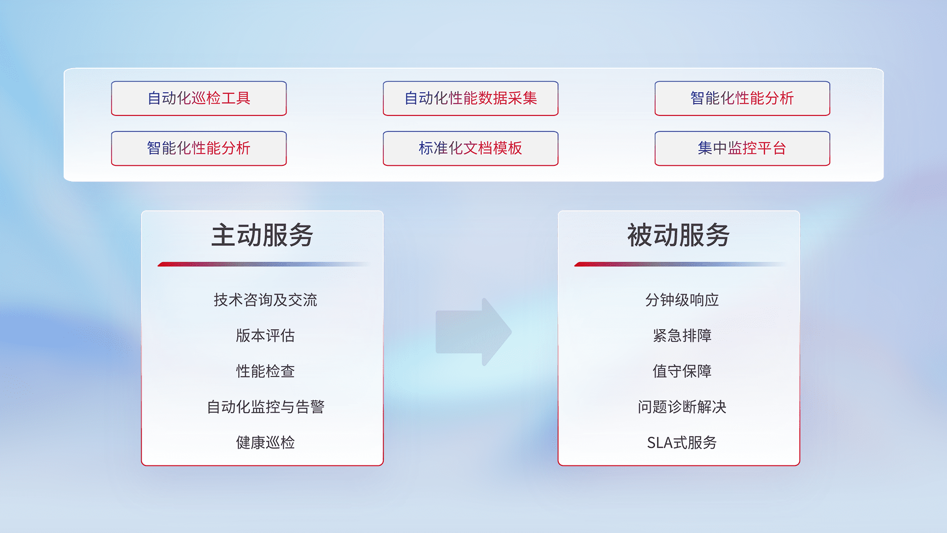 智能化工具和标准化文档,,保障服务质量,,,提供主动服务(包含技术咨询、、、、版本评估、、、、性能检查、、、自动化监控与告警、、健康巡检)和被动服务包含(分钟级响应、、、紧急排障、、值守保障、、、问题诊断解决、、SLA服务)。。。。